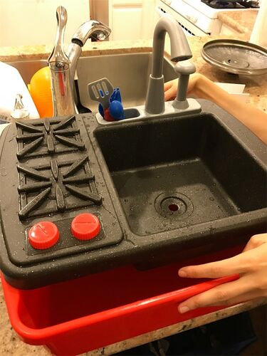 Fちゃんの大人のオモチャが、Amazonから届きました〜。 えっと……。 キッチンシンクのオモチャです。 あえて本物のシンクの裏側に置いてみました。 昔サンタクロースに貰ったな〜こーゆーの……(遠い目) ポンプをスコスコと押すとちゃんと水も出ます。小さな…
